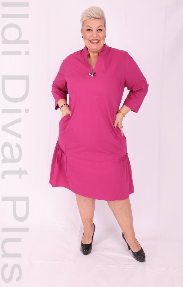 Marisis lila színű, oldalán fodros, nyak részén gyöngyös, lefelé bővülő fazonú ruha.