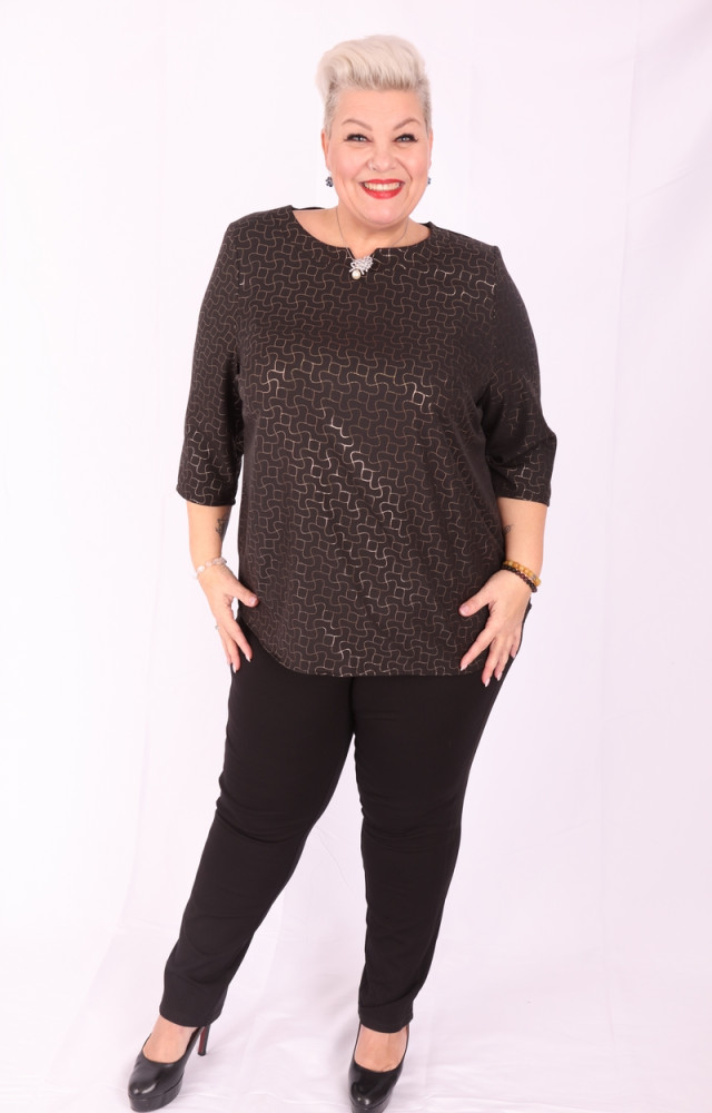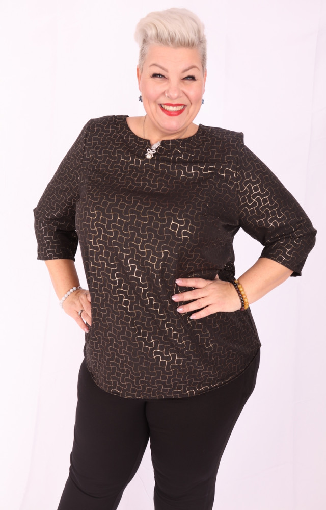 Maxi Lady fekete-arany mintás, lezser fazonú felső.