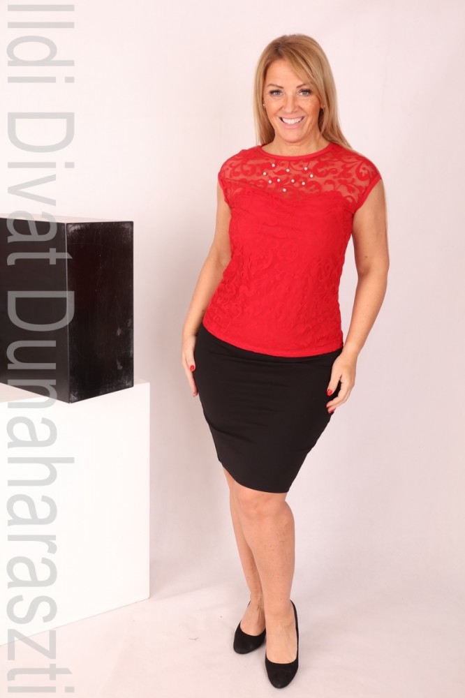 Maxima piros színű, kerek nyakú, csipkés, nyak résznél gyöngy díszítéses, karcsúsított fazonú felső.