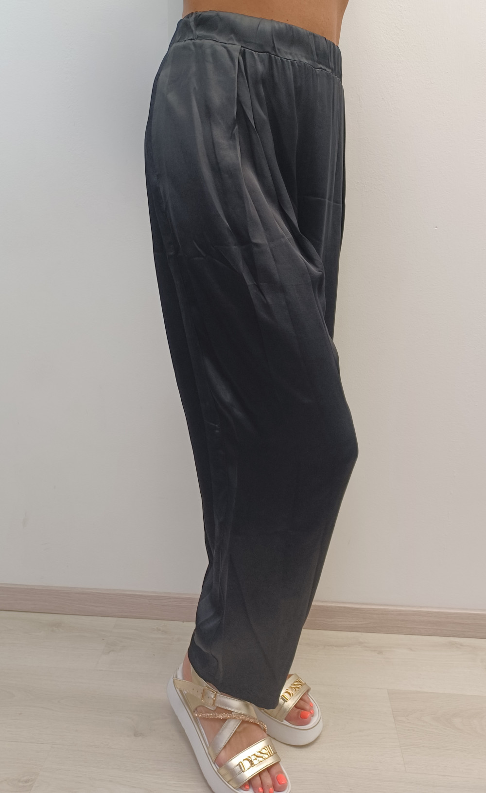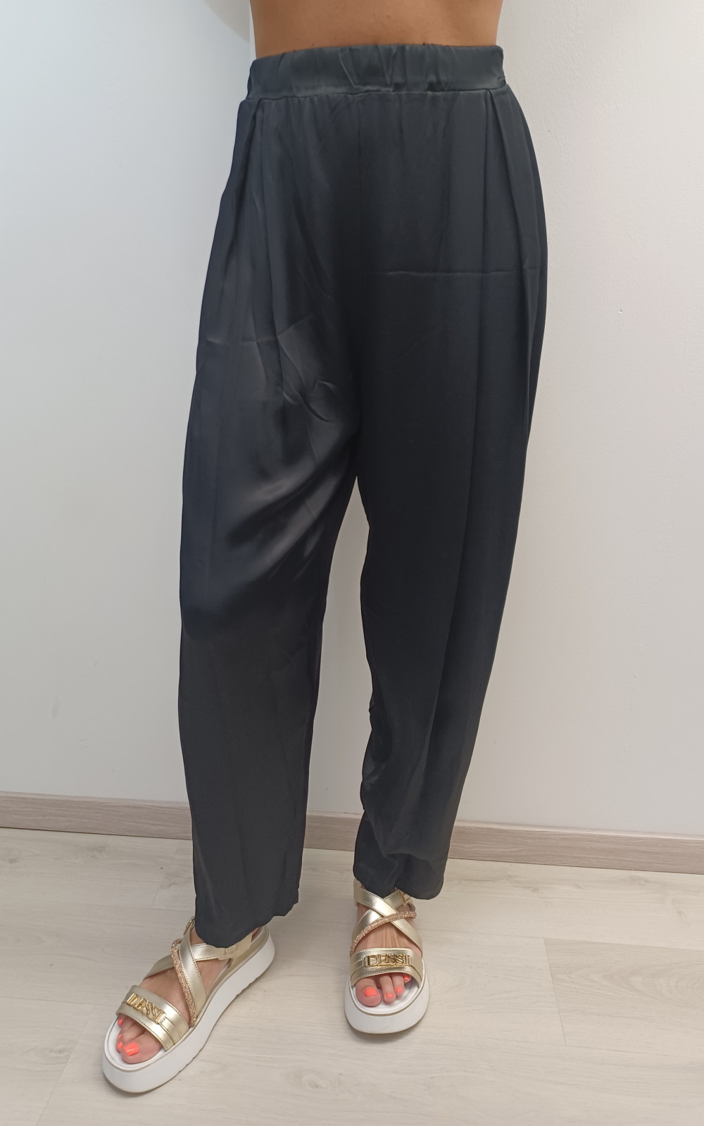 Fekete színű, gumis derekú, oldalán cipzáras nadrág.