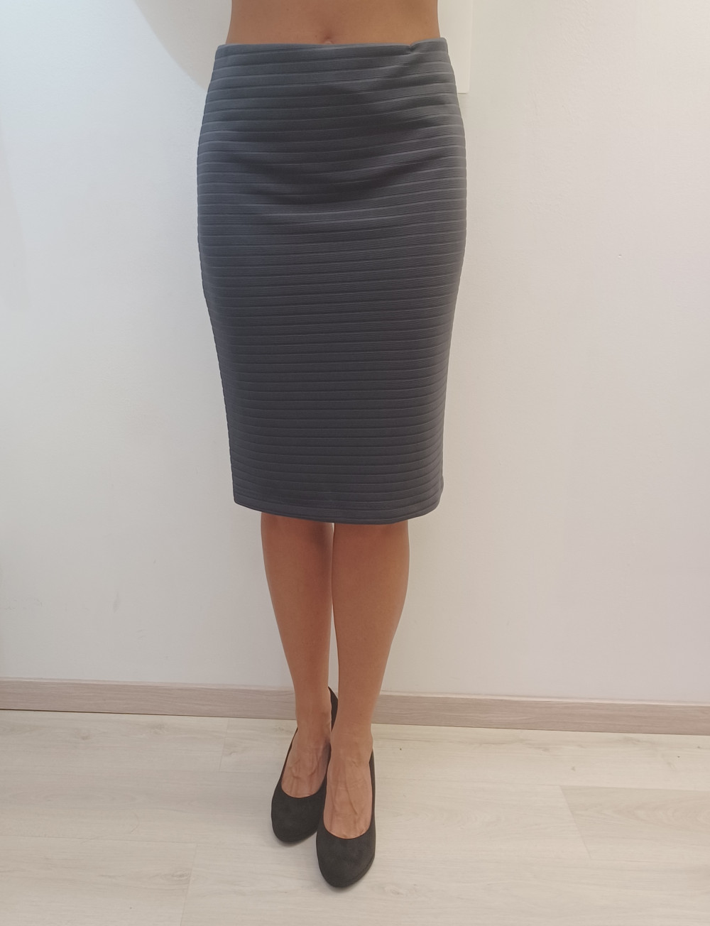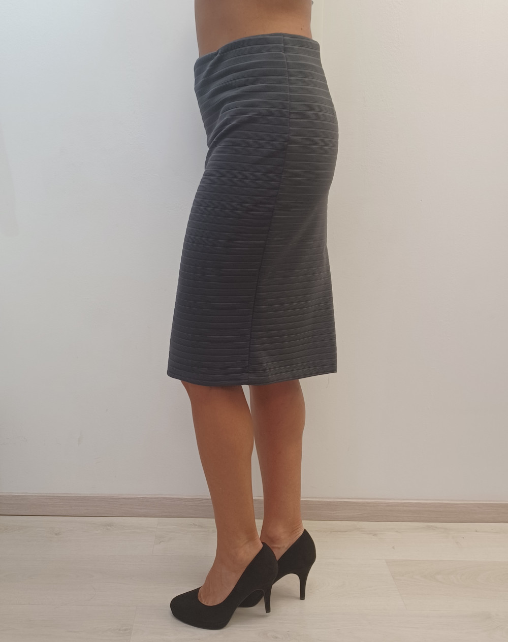 Sötétszürke színű, gumis derekú, alakformálós szoknya.