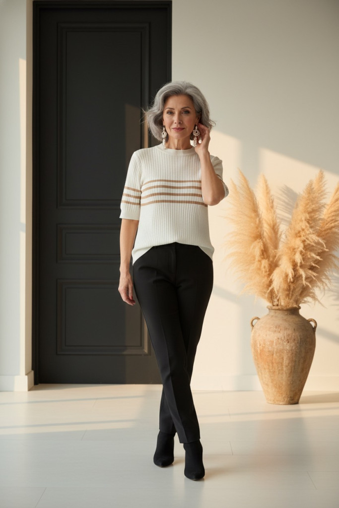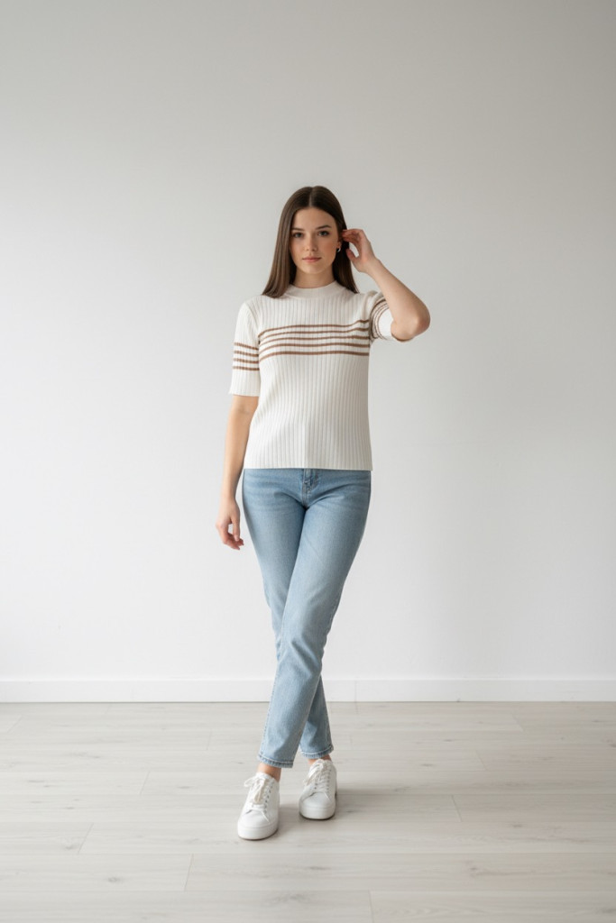 Micha fehér alpon beige csíkos bordás anyagú rövid ujjú kötött felső.