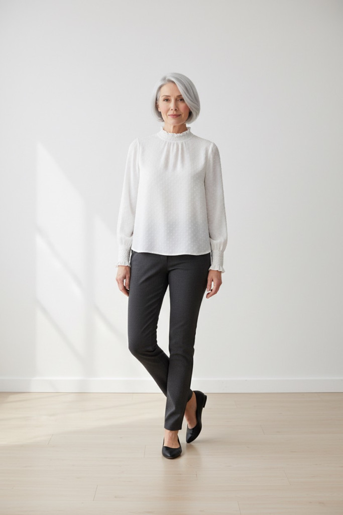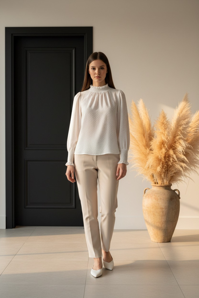 Micha fehér anyagában mintás gumis nyakú blúz.