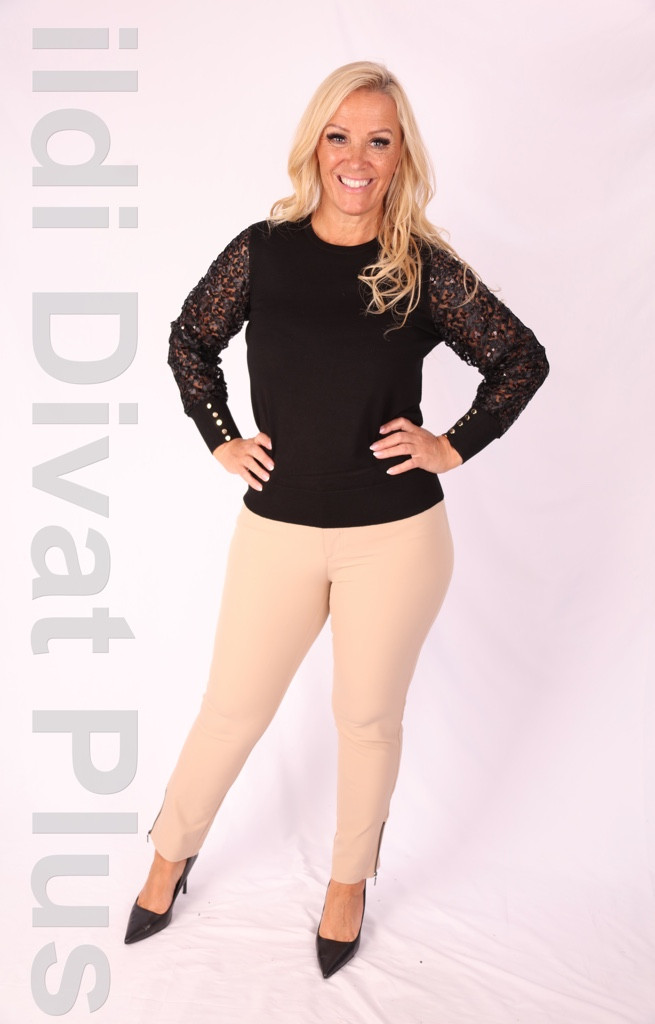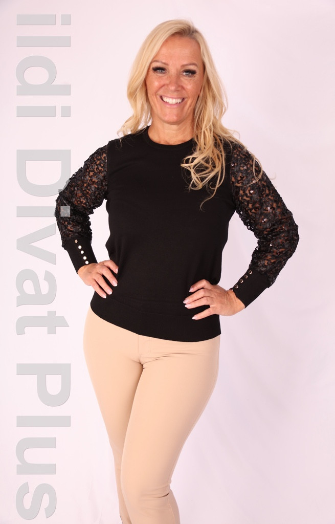 Micha fekete ujján hálós flitteres kerek nyakú gépi kötésű felső.