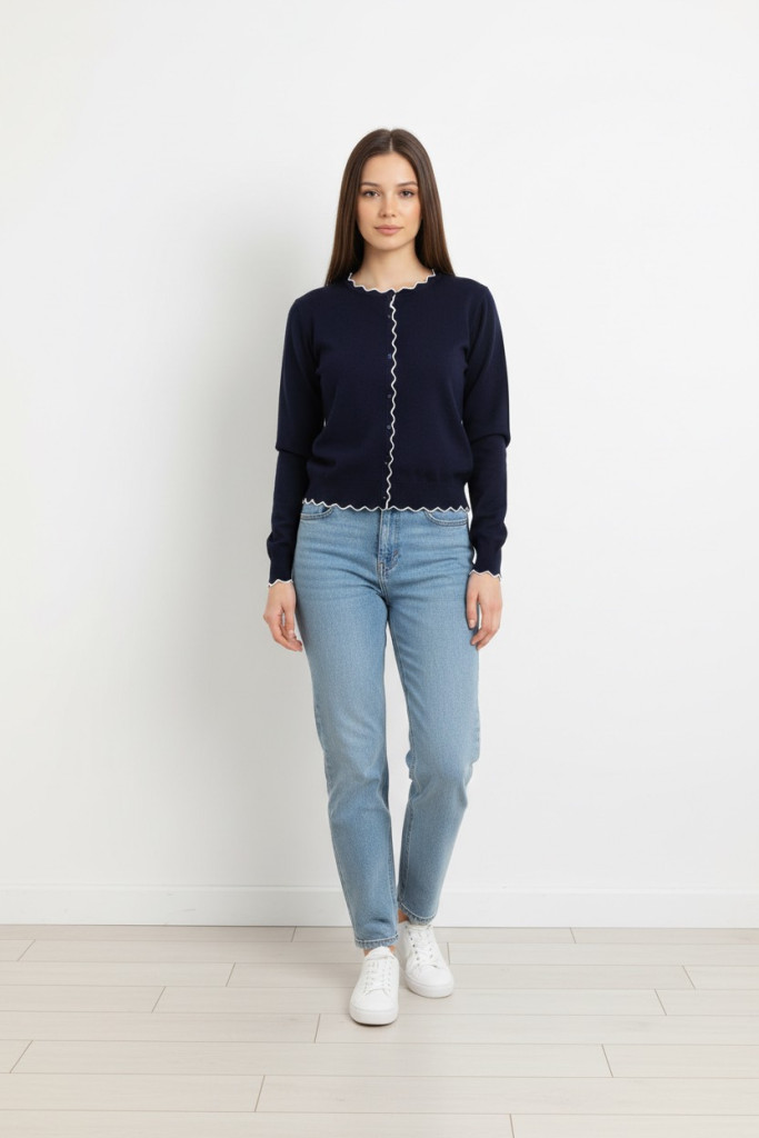 Micha kék alapon fehér cakkos szélű gombos kötött kardigán.