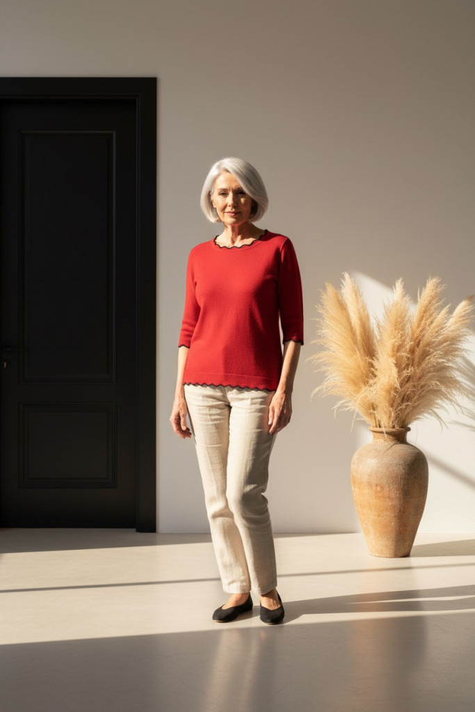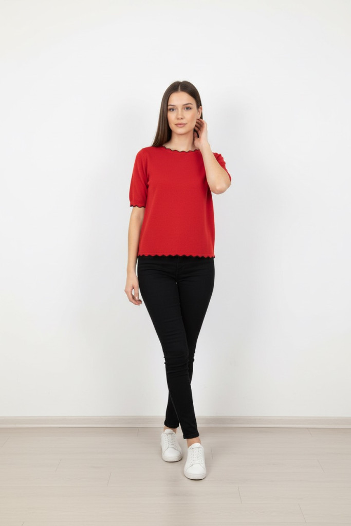 Micha piros alapon fekete cakkos szélű gombos kötött felső.