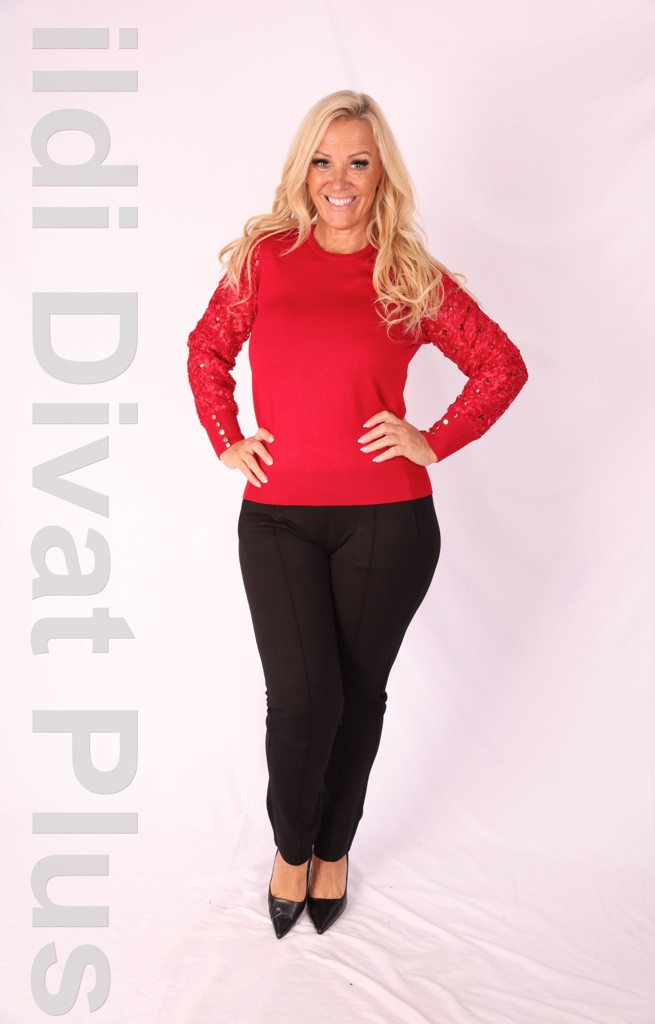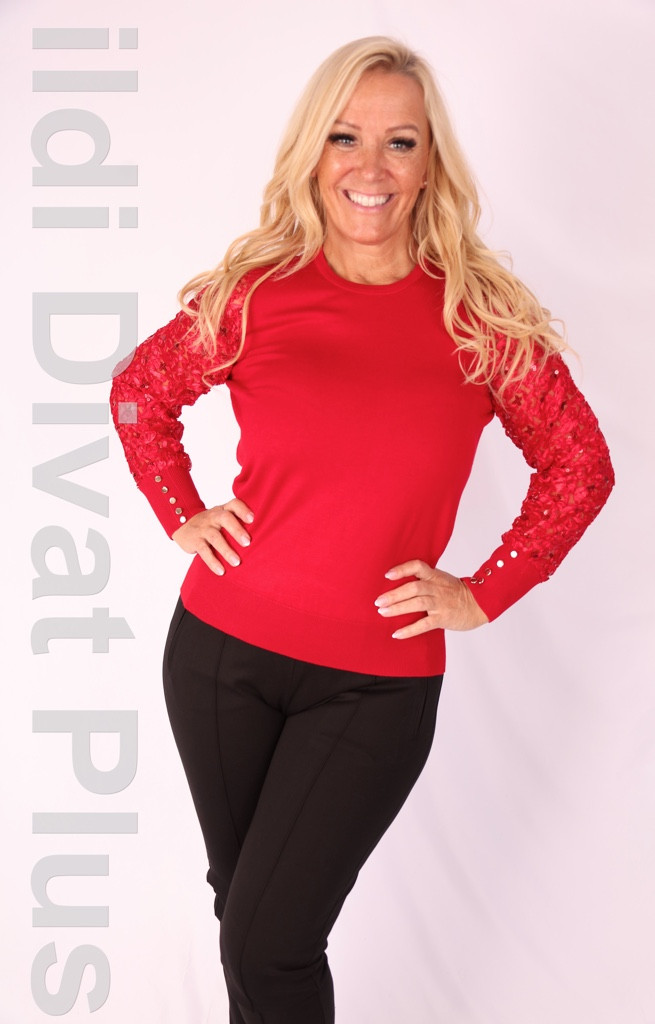 Micha piros ujján hálós flitteres kerek nyakú gépi kötésű felső.