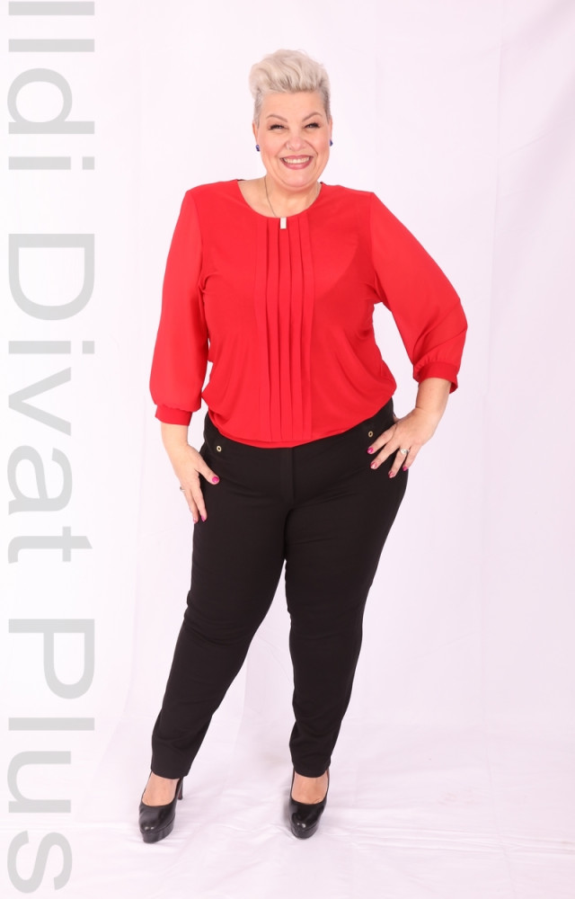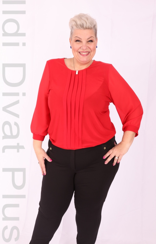 Milena piros színű, kerek nyakú, elején rakott, lezser fazonú felső.