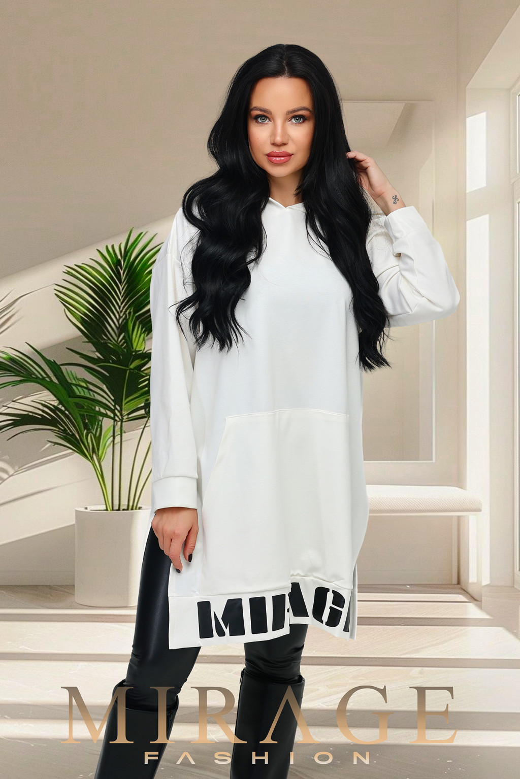 Mirage Fashion ekrü kapucnis elején fekete nyomott írásos tunika.