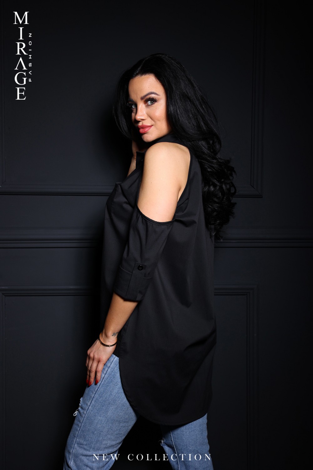 Mirage Fashion fekete színű, vállán kivágott, galléros, elején díszgombos, alján megkötős és aszimmetrikus, lezser fazonú ingtunika.