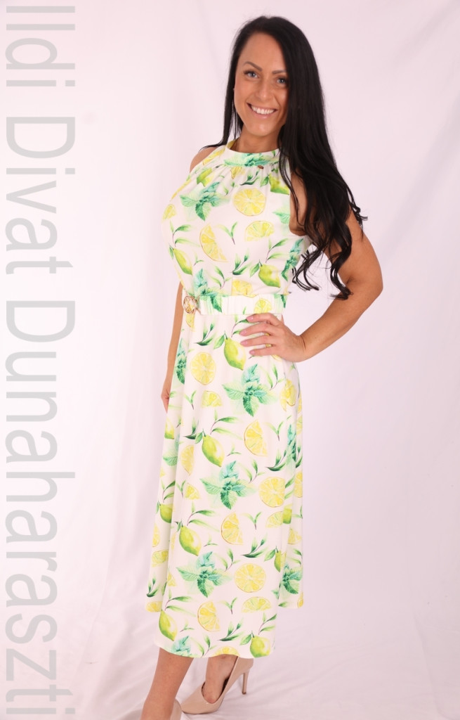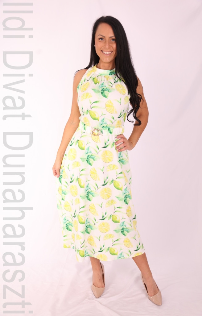 Mystic Day fehér alapon citrom mintás, nyakban magasan zárt, zsebes, derekán öves, A-vonalú ruha.