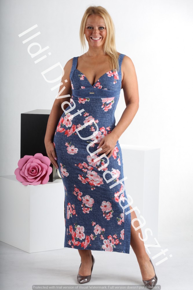 Mystic Day farmehatású alapon virágmintás, dekoltált, kétoldalt slicces, karcsúsított fazonú midi ruha.