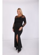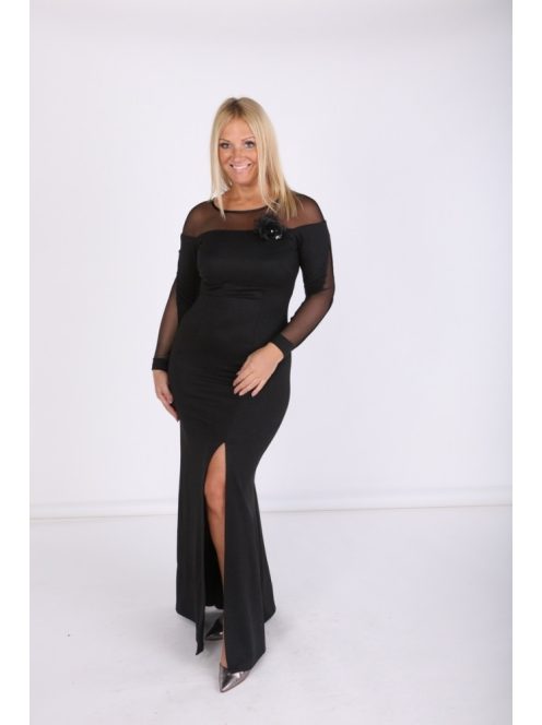 Mystic Day csillogós fekete színű, tetején és ujján necc betétes,elején sliccelt,maxi ruha.
