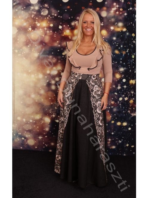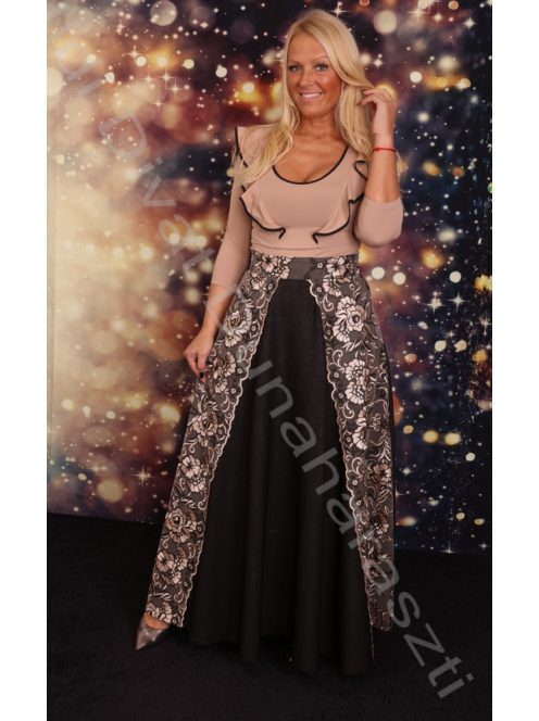 Mystic Day fekete csillogós alapon, elején bézs-fekete csipke betétes, lefelé bővülő fazonú maxi szoknya.