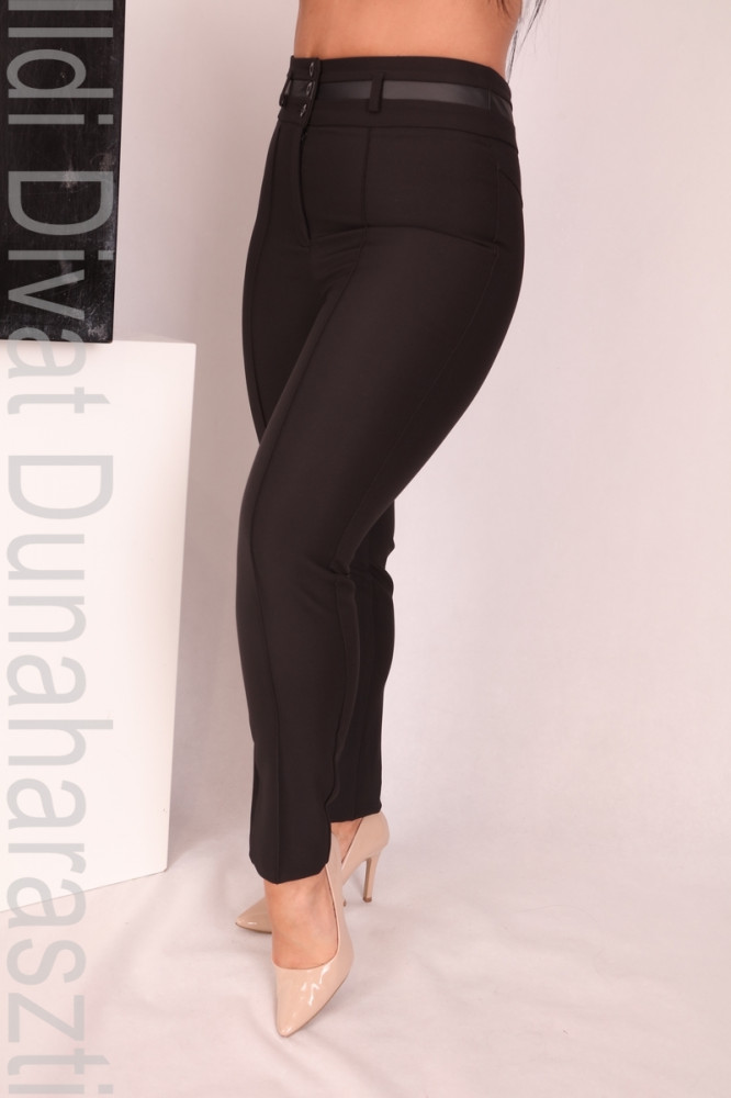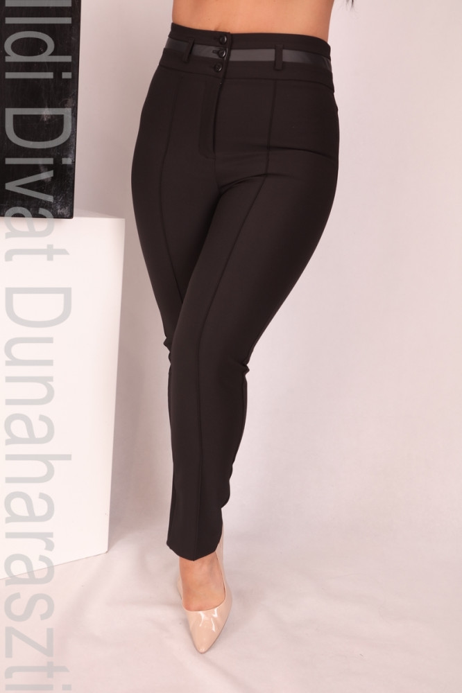 Mystic Day fekete színű, derék részén fekete műbőr betétes, három gombos, magasított derekú, élére varrt, elegáns nadrág.