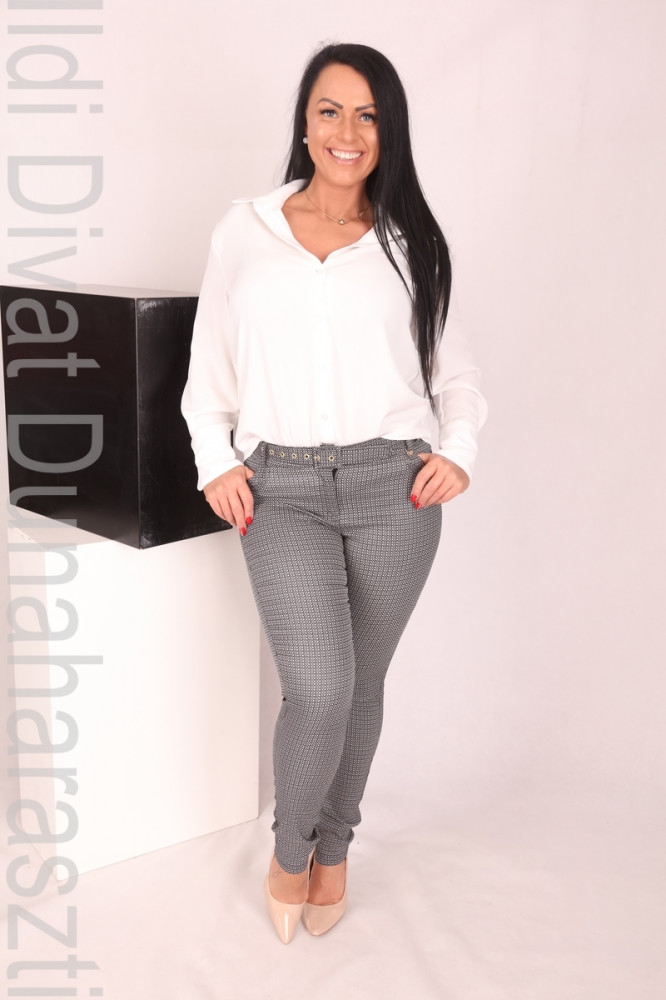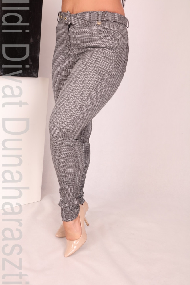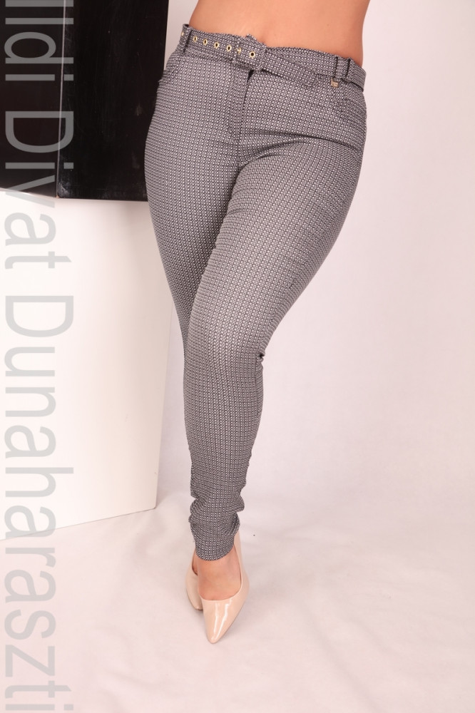 Mystic Day fekete alapon fehér pöttyös, derekán öves, elején díszzsebes és hátul zsebes, egyenes szárú, sztreccs vásznas nadrág.