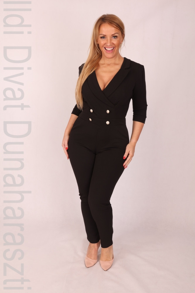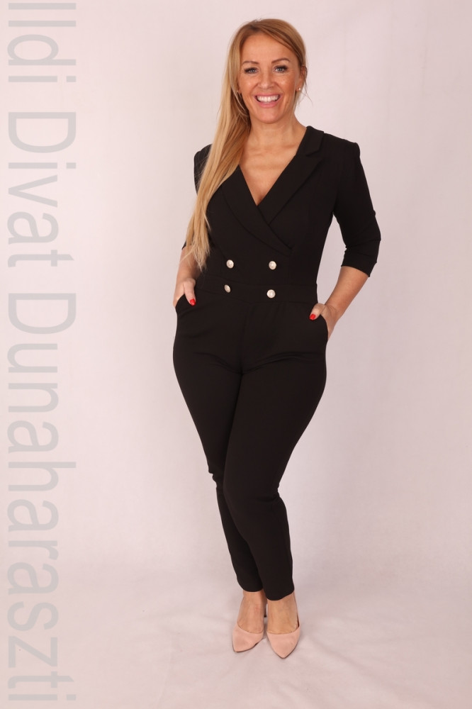 Mystic Day fekete színű, galléros és V-kivágott, válltöméses, arany színű díszgombos, zsebes, karcsúsított fazonú overál.