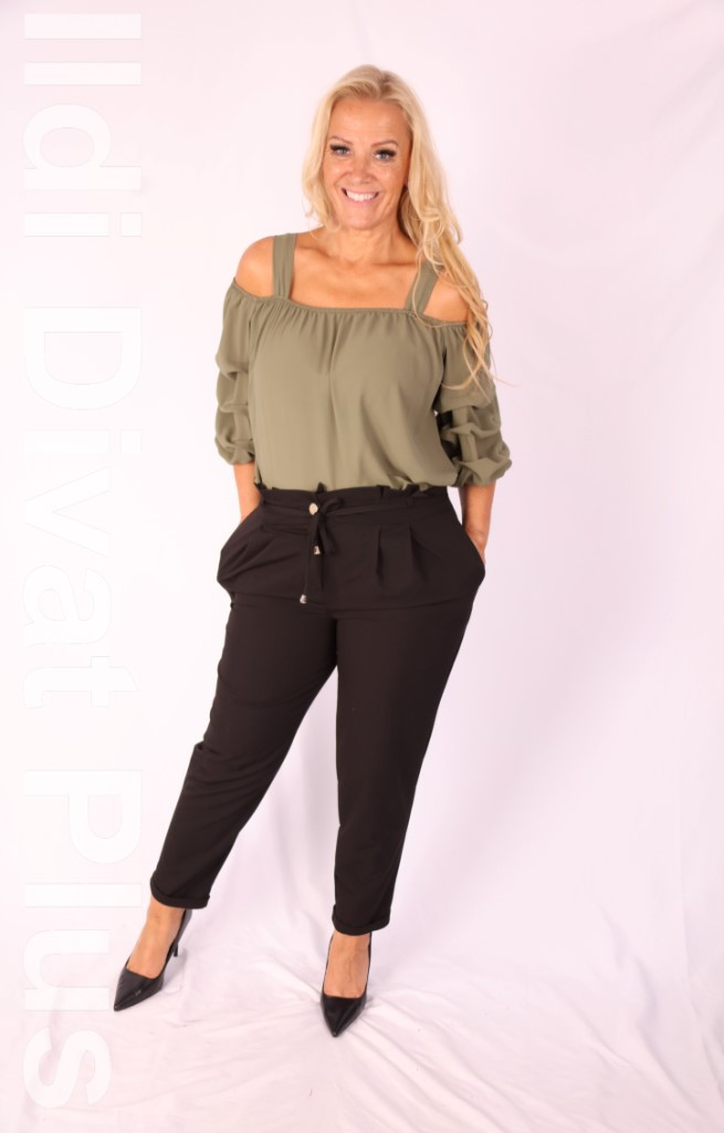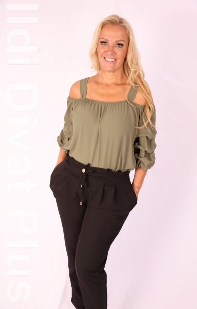 Mystic Day khaki színű, váll résznél kivágott, buggyos ujjú, tetején és ujja végén gumírozott, egyenes fazonú felső.