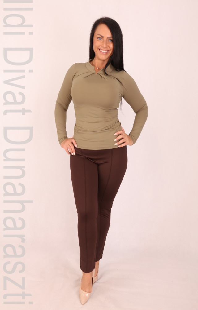 Mystic Day khaki színű, karcsúsított fazonú, sztreccses anyagú, nyak részén magasított, tűzött, sportosan elegáns felső.