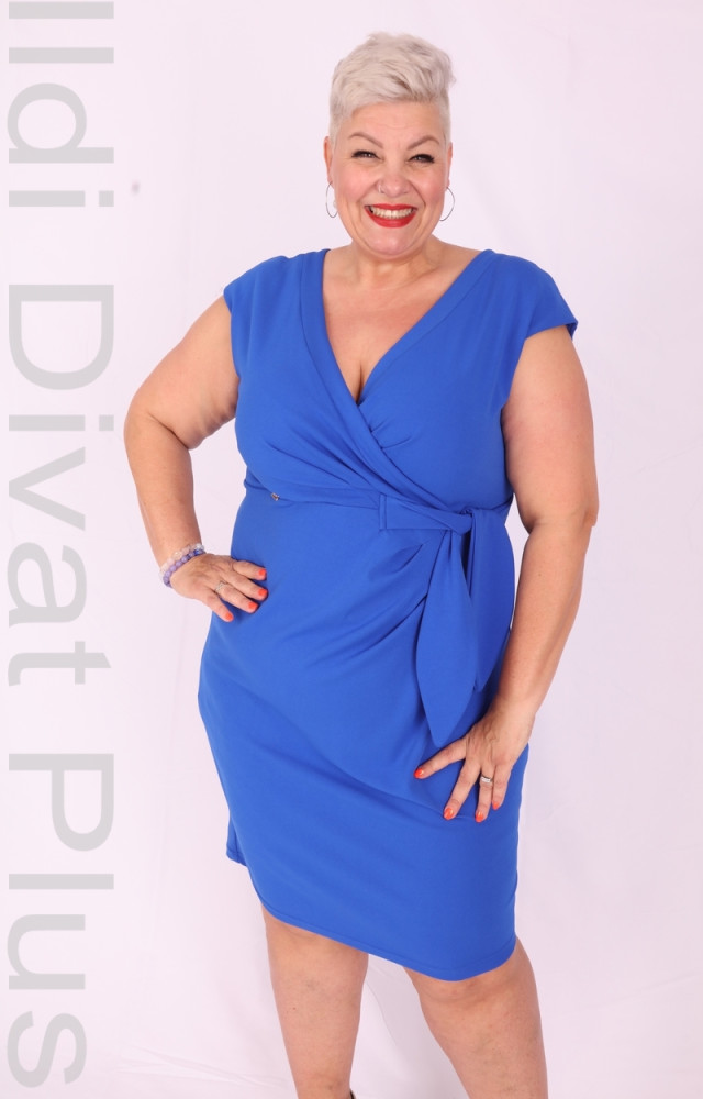 Mystic Day királykék színű, V-kivágott, átlapolt, oldalán kötős, ujjatlan, karcsúsított fazonú ruha.