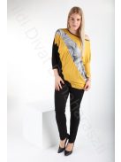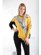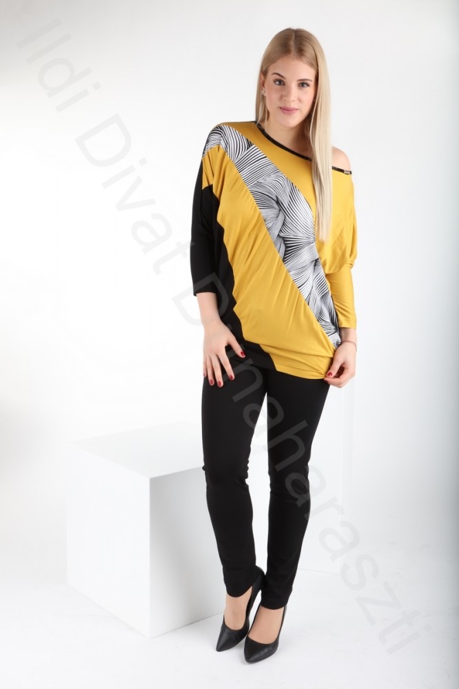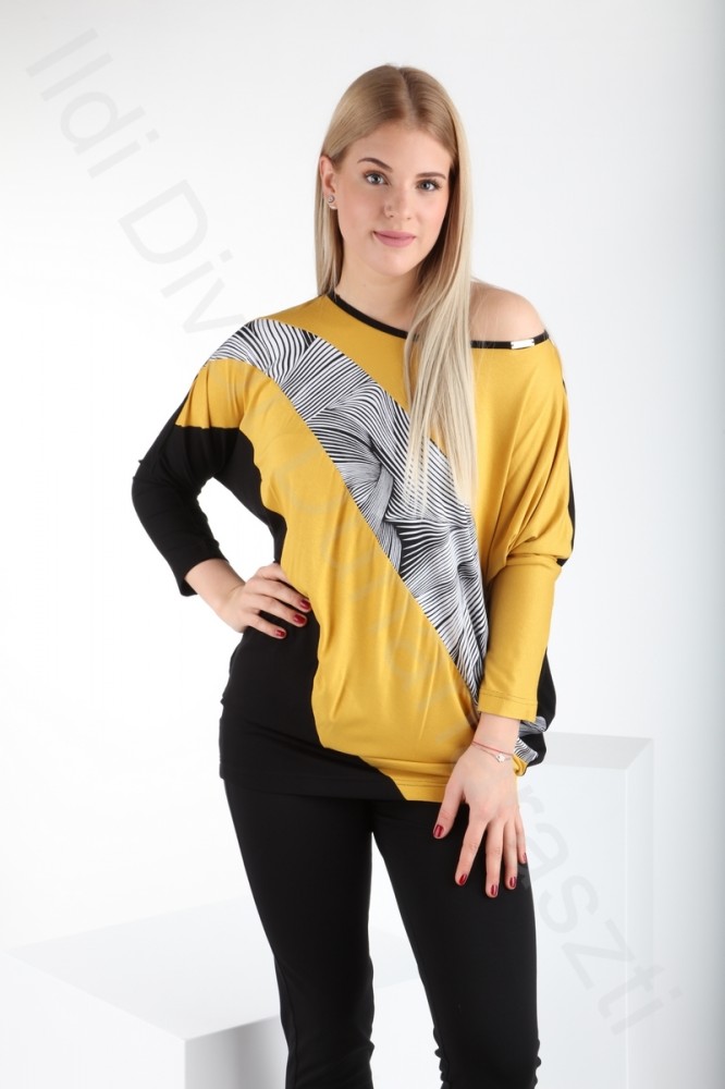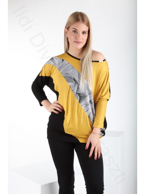 Mystic Day fekete alapon, fekete-fehér mintás és mustársárga betétes, bő fazonú felső.