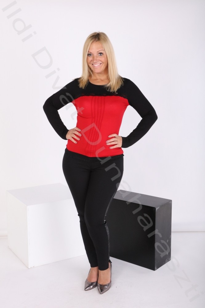Mystic Day piros-fekete színű, elején díszvarrásos, alján csipkés, karcsúsított fazonú felső.