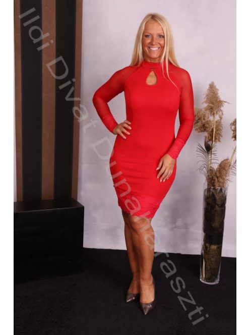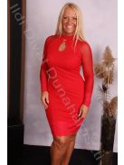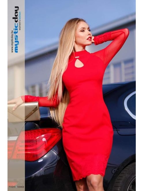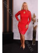 Mystic Day piros színű, garbós nyakú, csepp kivágott, necces ujjú, karcsúsított fazonú ruha.
