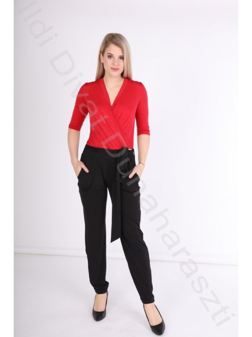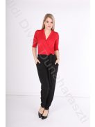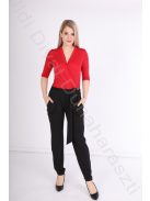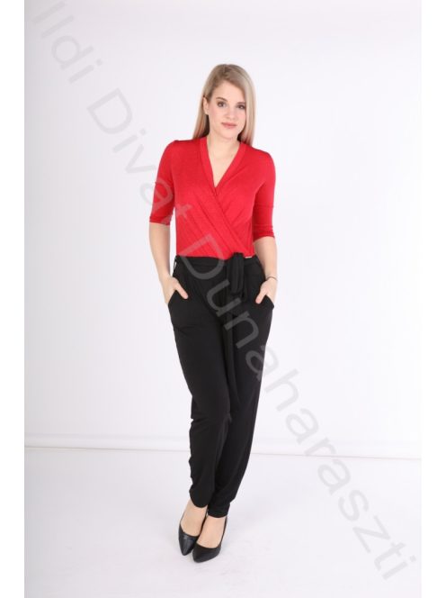 Mystic Day piros alapon csillámos tetejű, fekete aljú, tetején átlapolt overál.