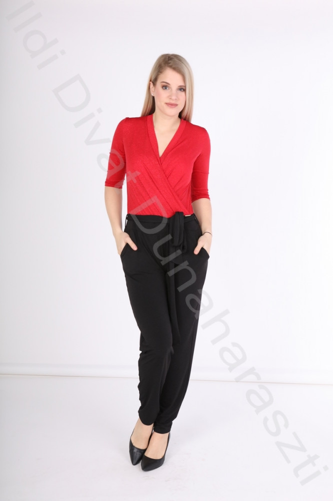 Mystic Day piros alapon csillámos tetejű, fekete aljú, tetején átlapolt overál.