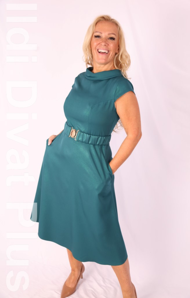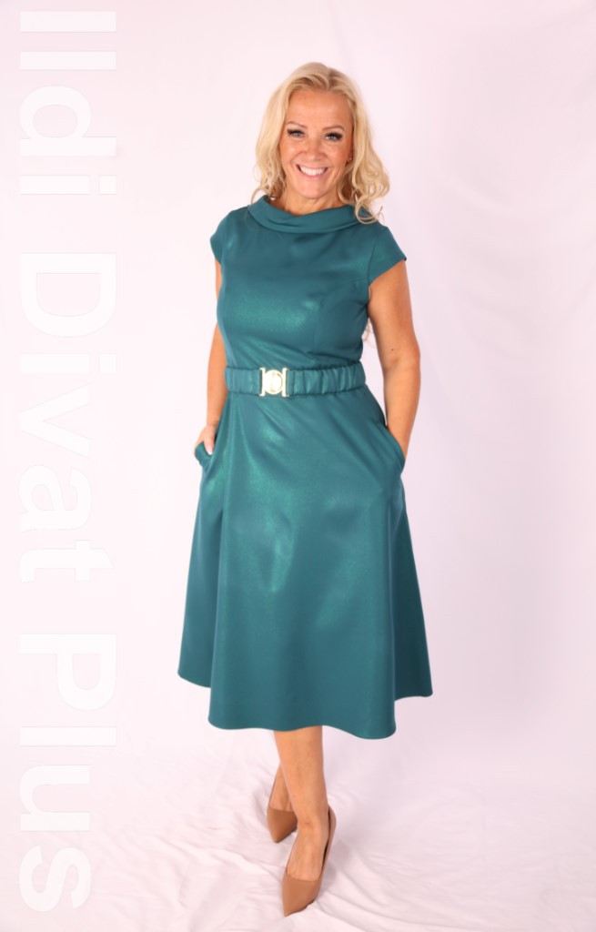Mystic Day smaragdzöld színű anyagában csillogós, kámzsás nyakkivágású, derekán öves, A-vonalú és midi hosszúságú ruha.