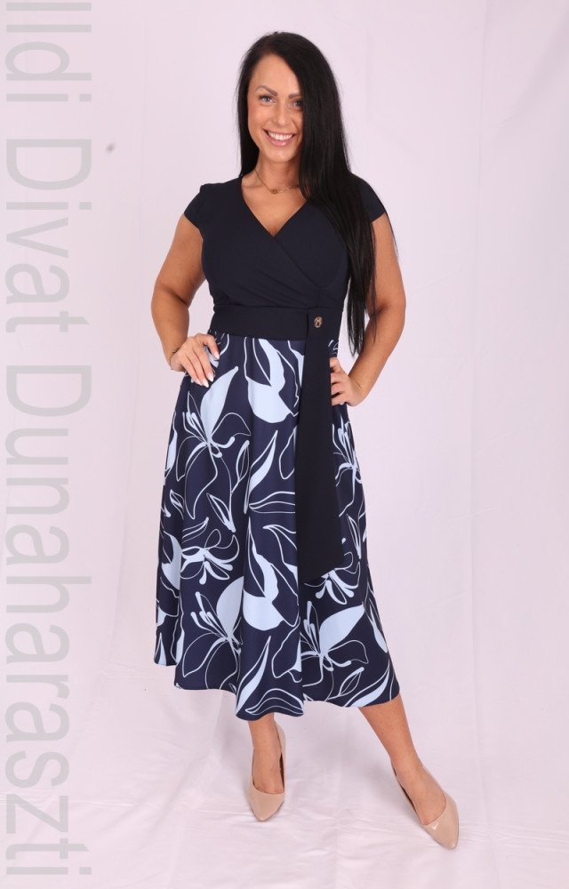 Mystic Day felső részén sötétkék színű, szoknya részén sötétkék-babakék mintás, mell részén átlapolt, elején díszpántos, A-vonalú és midi hosszúságú ruha.