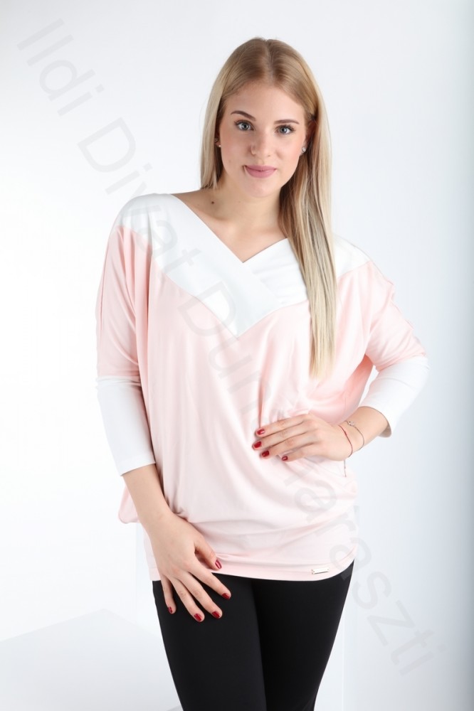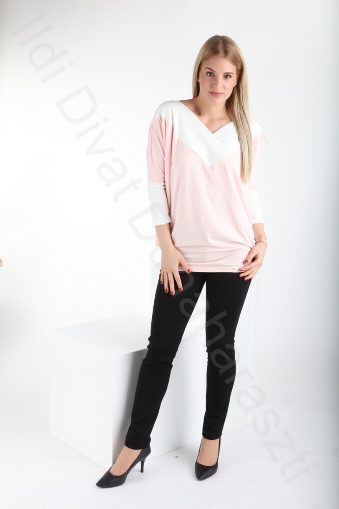 Mystic Day púder alapon fehér betétes, V-kivágott, bő fazonú felső.