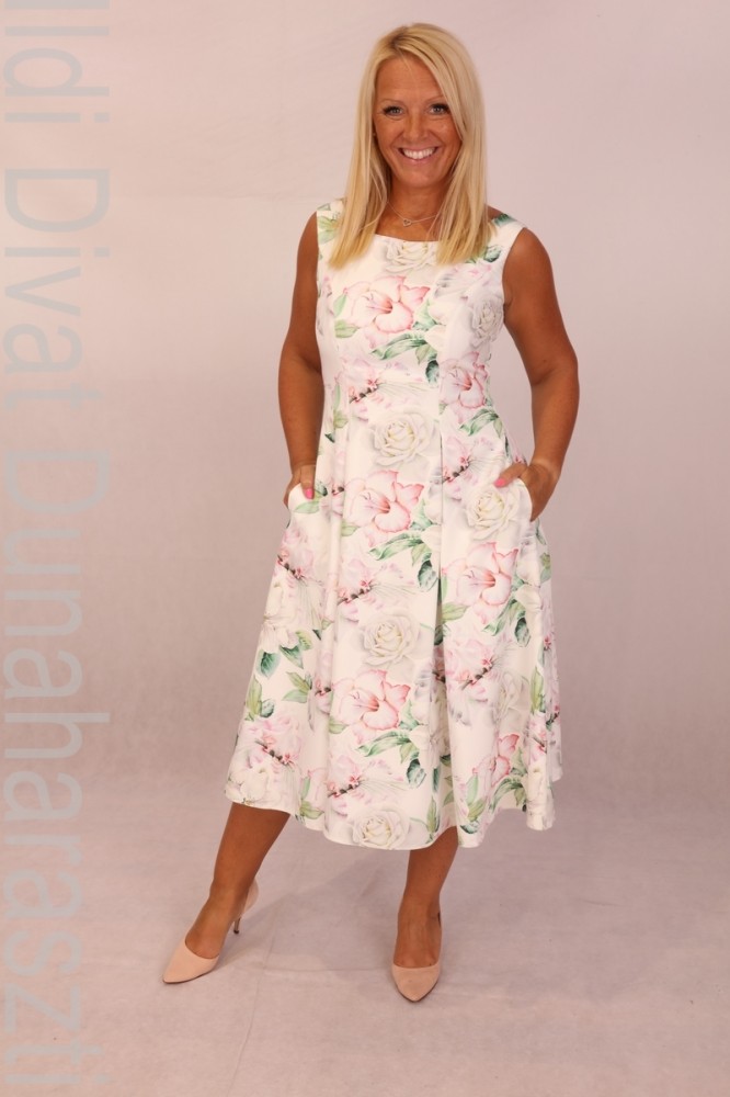 Mystic Day fehér alapon virágmintás, derékban karcsúsított, A-vonalú ruha.