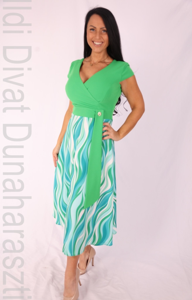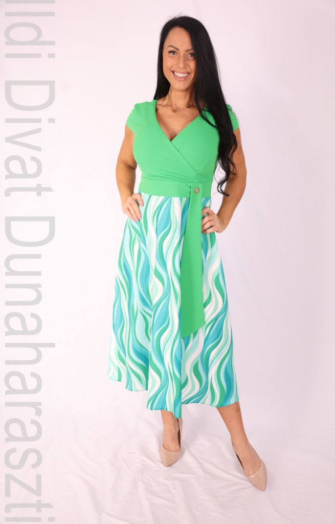 Mystic Day zöld-türkiz-fehér hullám mintás, mell részén átlapolt, elején díszpántos, A-vonalú és midi hosszúságú ruha.