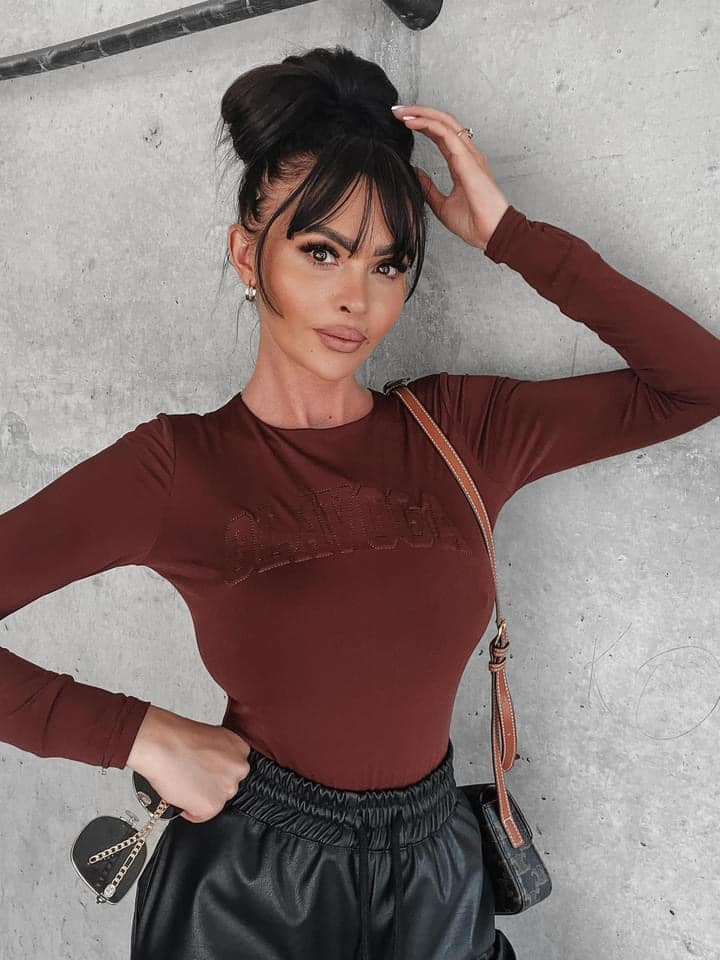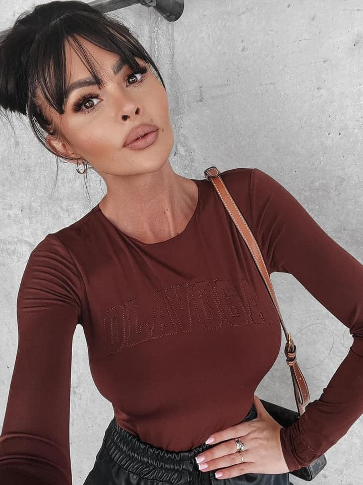 O'la Voga barna színű, elején varrt feliratos, karcsúsított fazonú body.