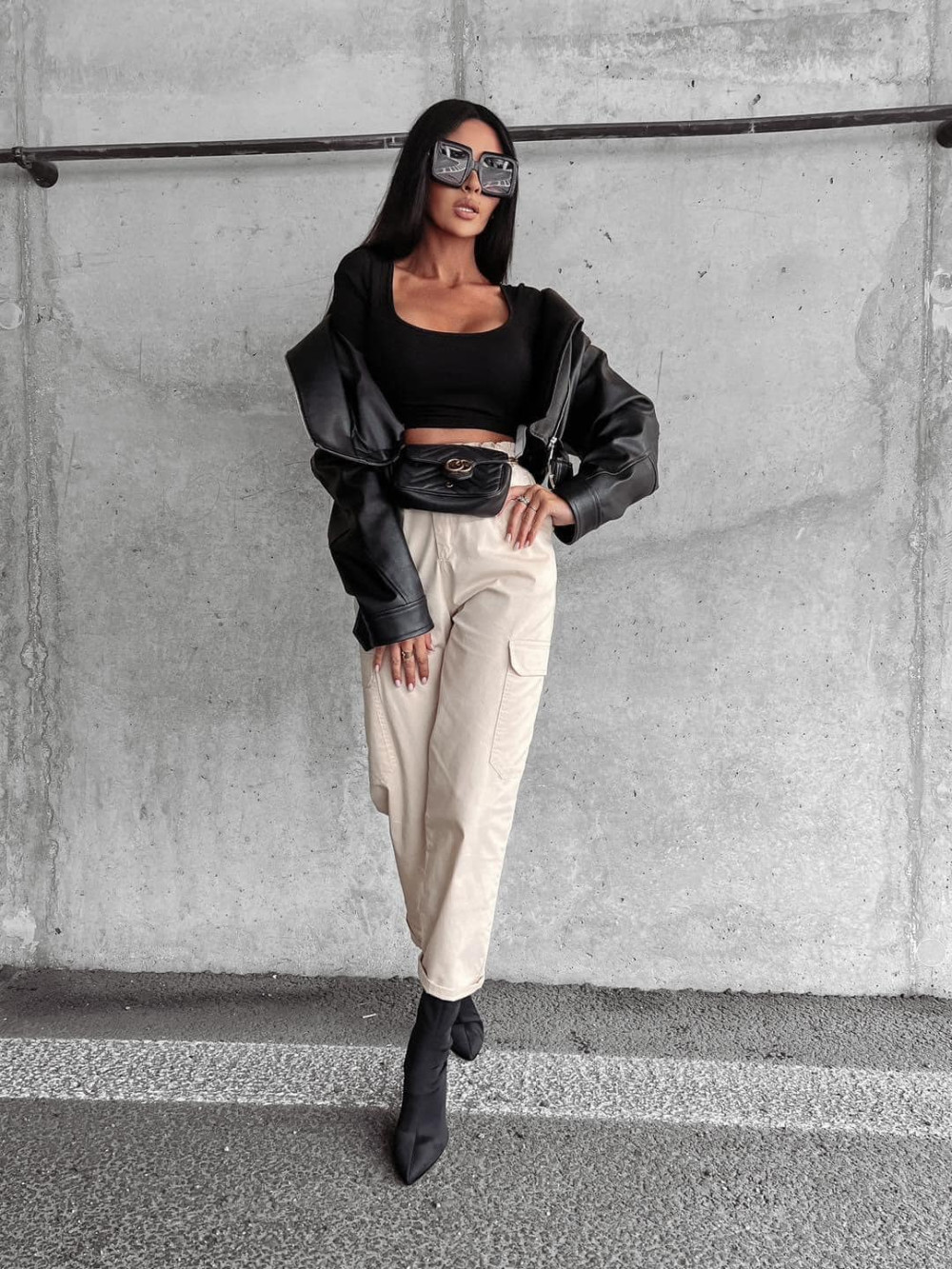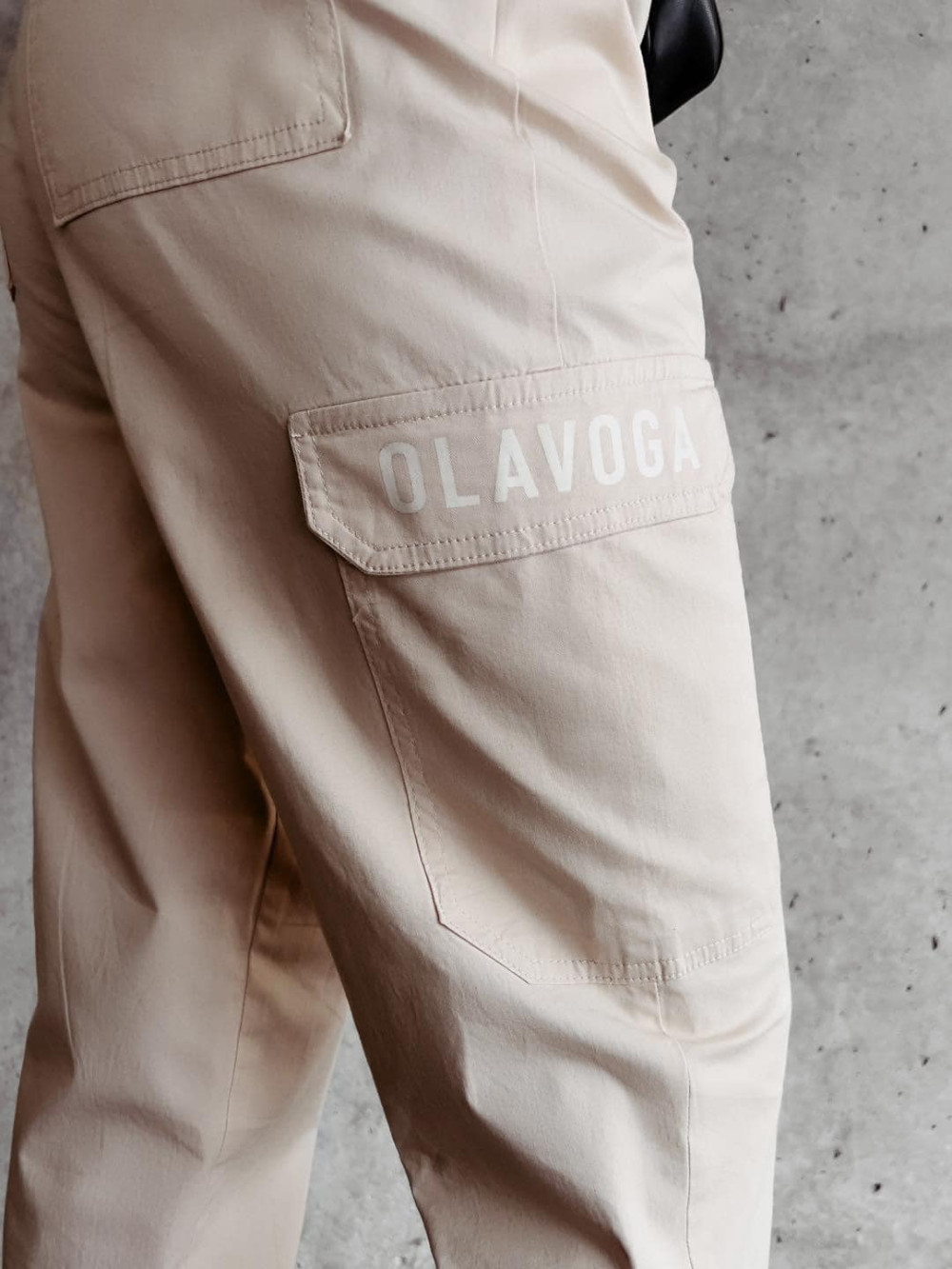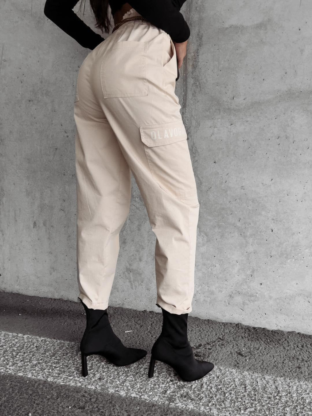 O'La Voga bézs színű, vásznas anyagú, derekán gumírozott és gombos, zsebes, magasított derekú, egyenes szárú nadrág.