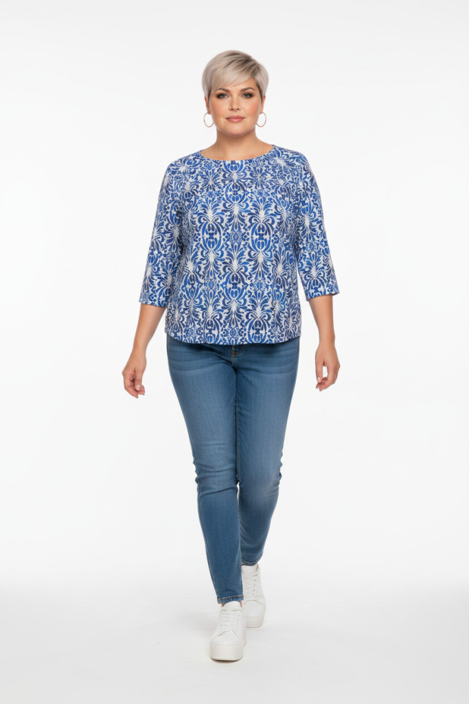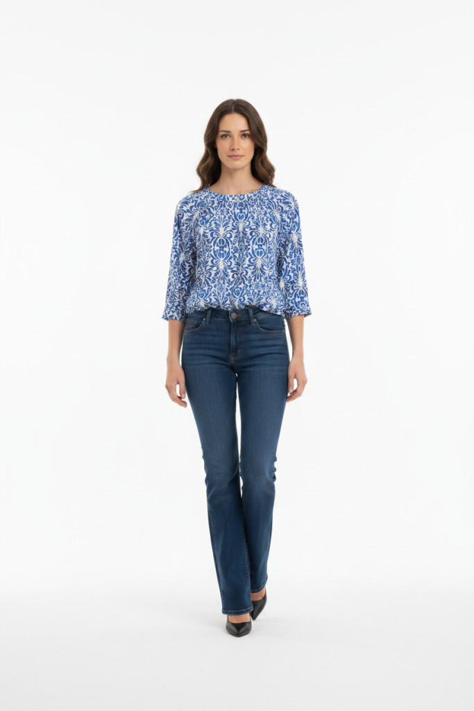 Olsen fehér-kék mintás kerek nyakú alján gumis blúz.