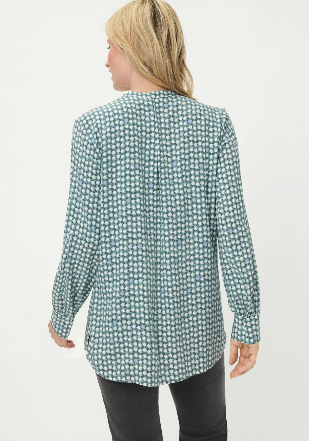 Olsen zöld-fehér minás kerek nyakú gombos blúz.