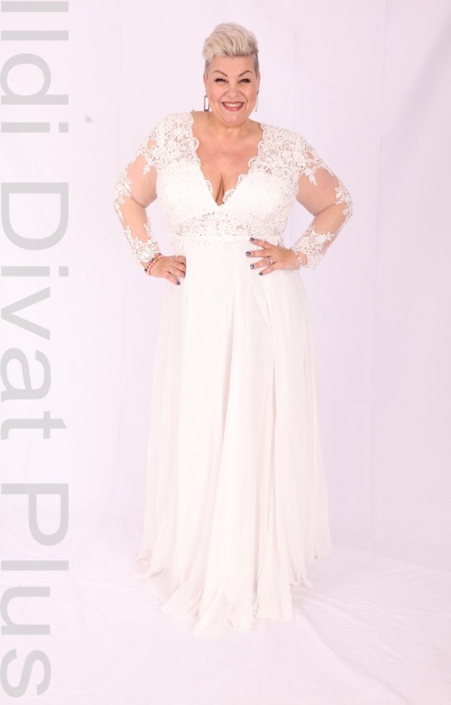 Pretty Woman fehér színű, V-kivágott, tetején csipkés, necces ujjú, sliccelt, A-vonalú ruha.