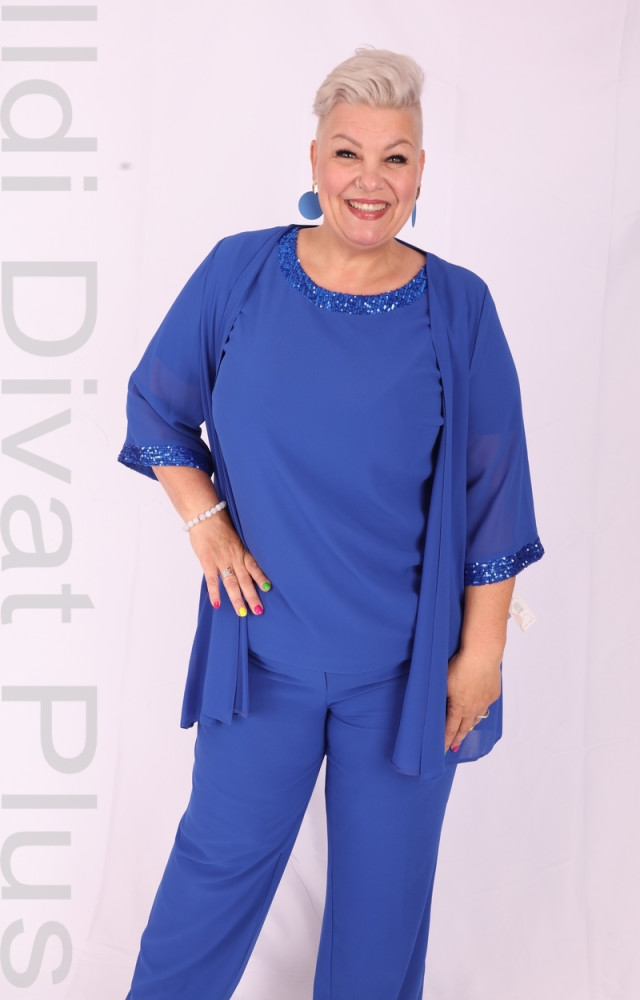 Királykék háromrészes nadrágos muszlinos szett.