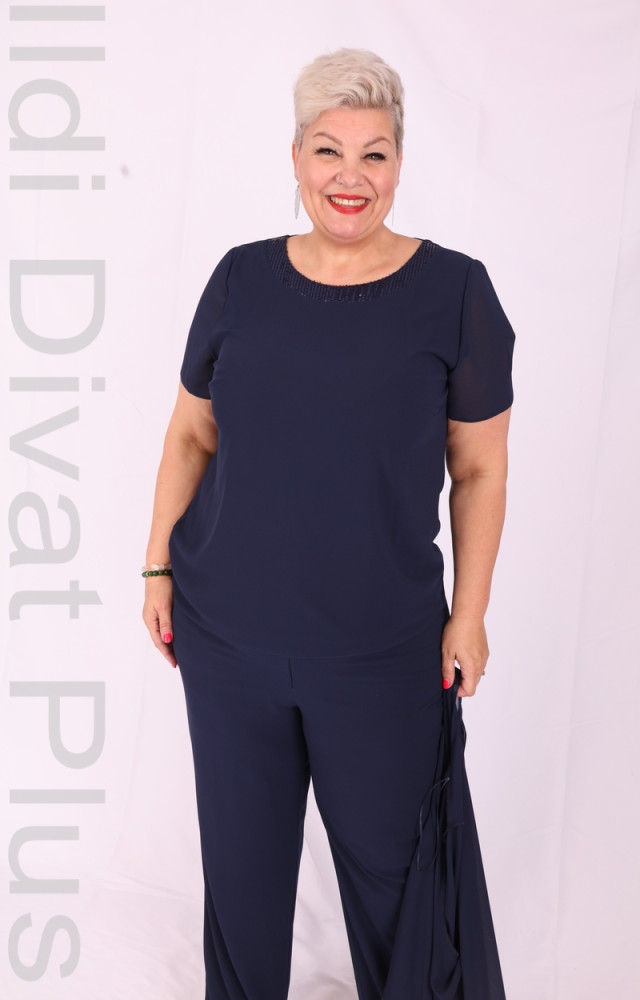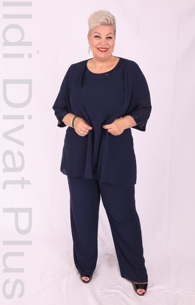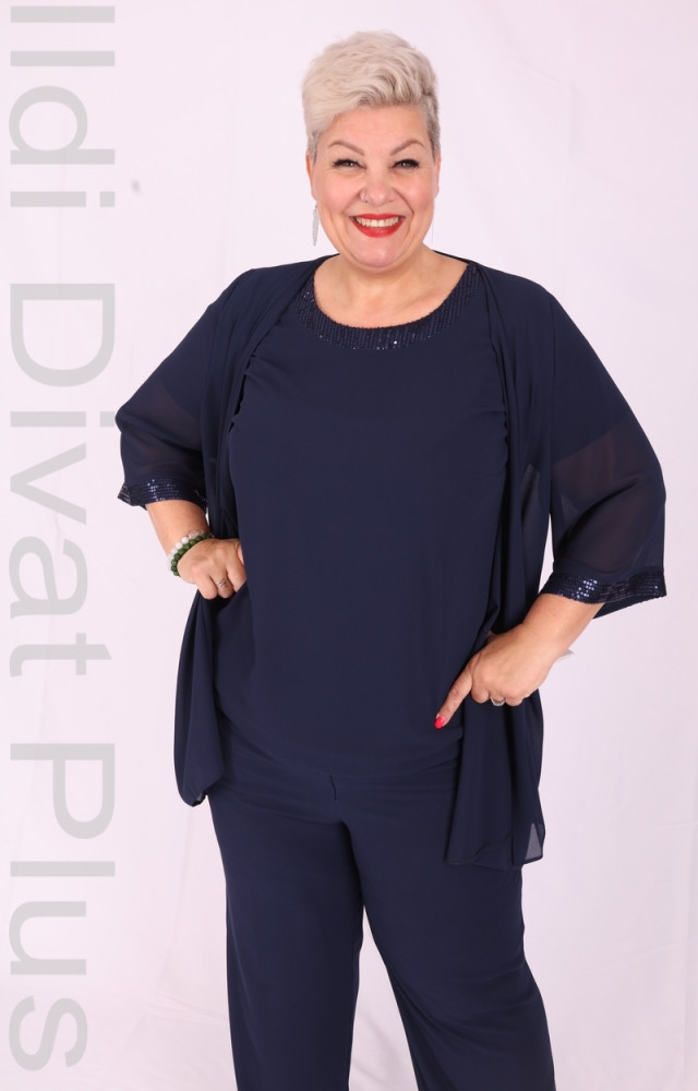 Sötétkék háromrészes nadrágos muszlinos szett.
