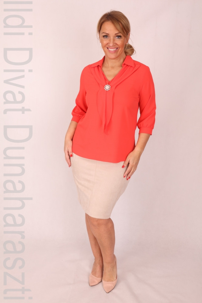 Selent narancssárga színű, galléros, nyak résznél gyöngy díszítéses, lezser fazonú blúz.