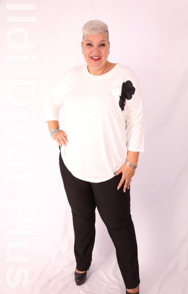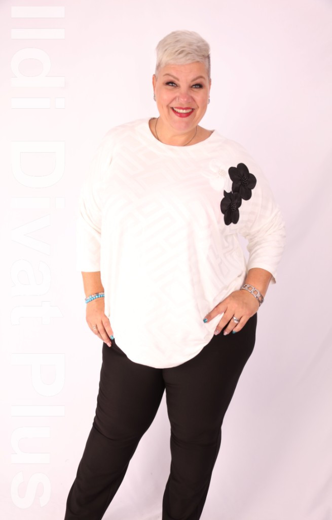 Sinyora fehér anyagában minbtás fekete virágos gyöngyös tunika