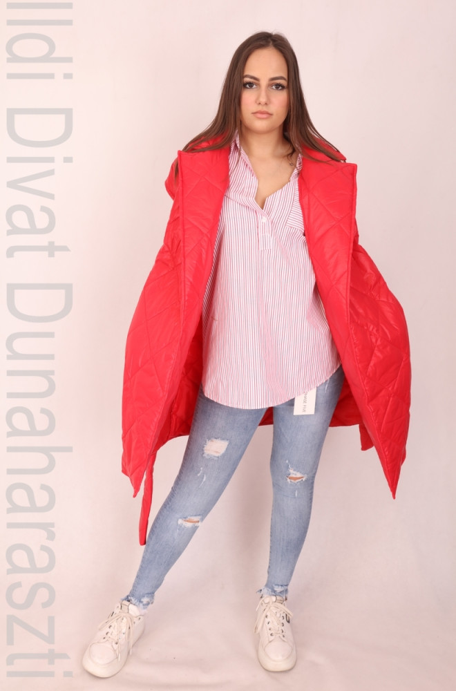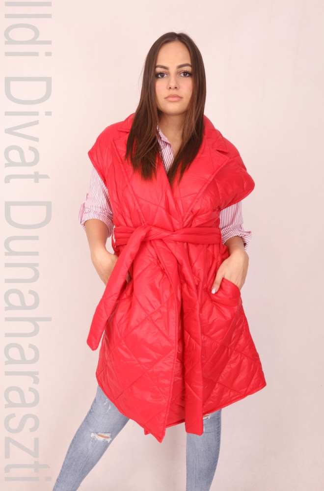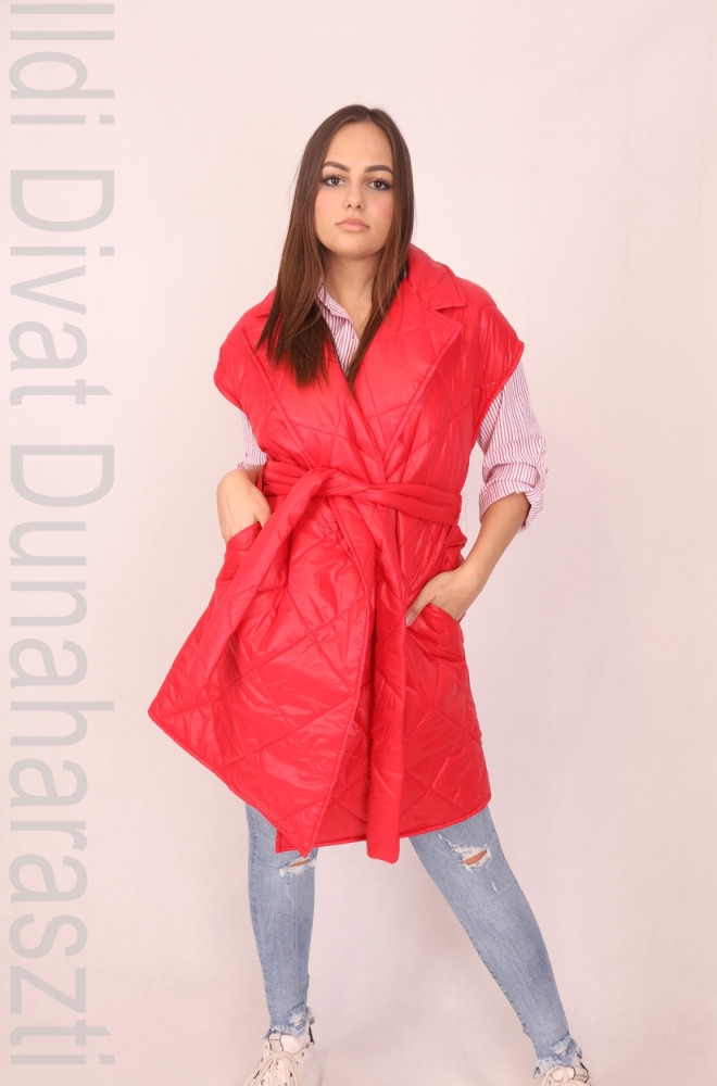 Spring Edition piros színű, steppelt, galléros, átlapolós és megkötős, zsebes, hosszított fazonú mellény.
