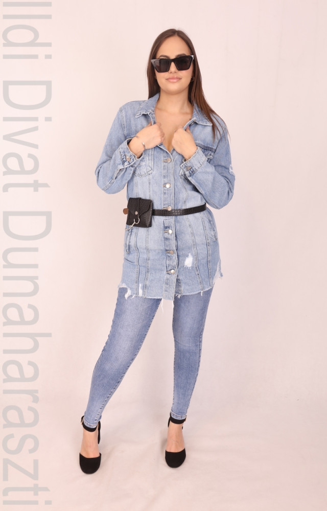 Spring Edition világos színű, galléros,elején zsebes és végig gombos, szaggatott, hosszított és karcsúsított fazonú farmerkabát.