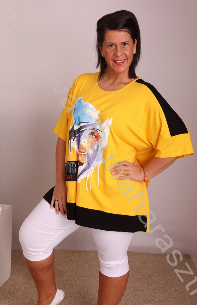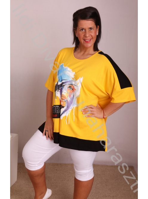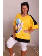 Sinyora sárga-fekete színű, kerek nyakú, elején mintás, lezser fazonú felső.