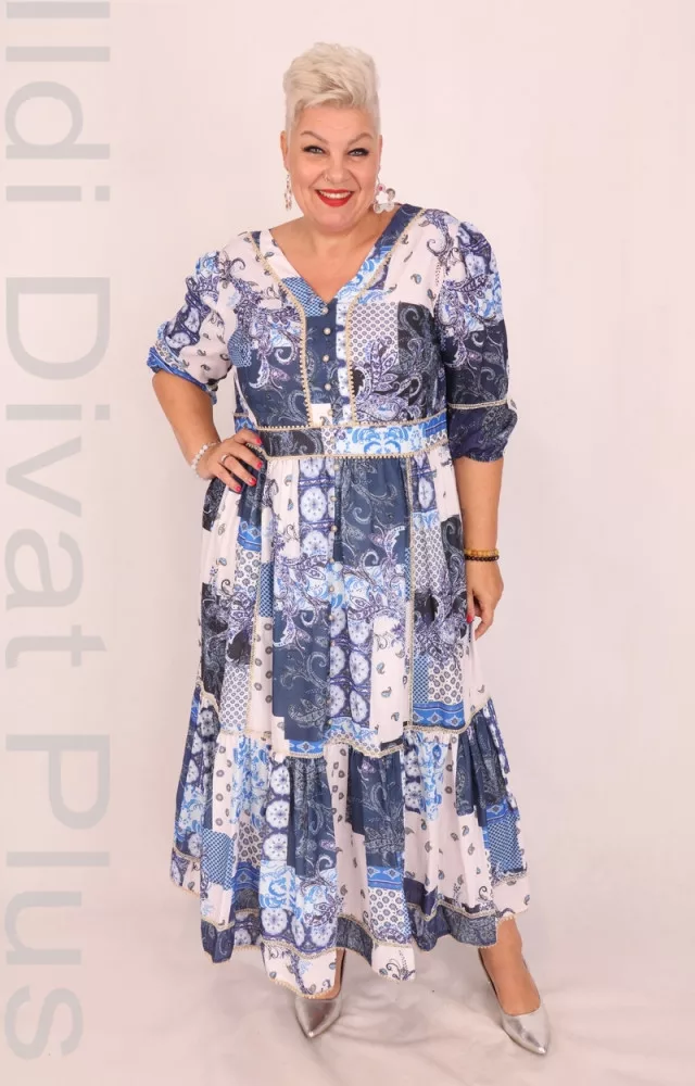 Top Woman kék-fehér mintás, V-kivágott, fodros aljú, lefelé bővülő ruha.