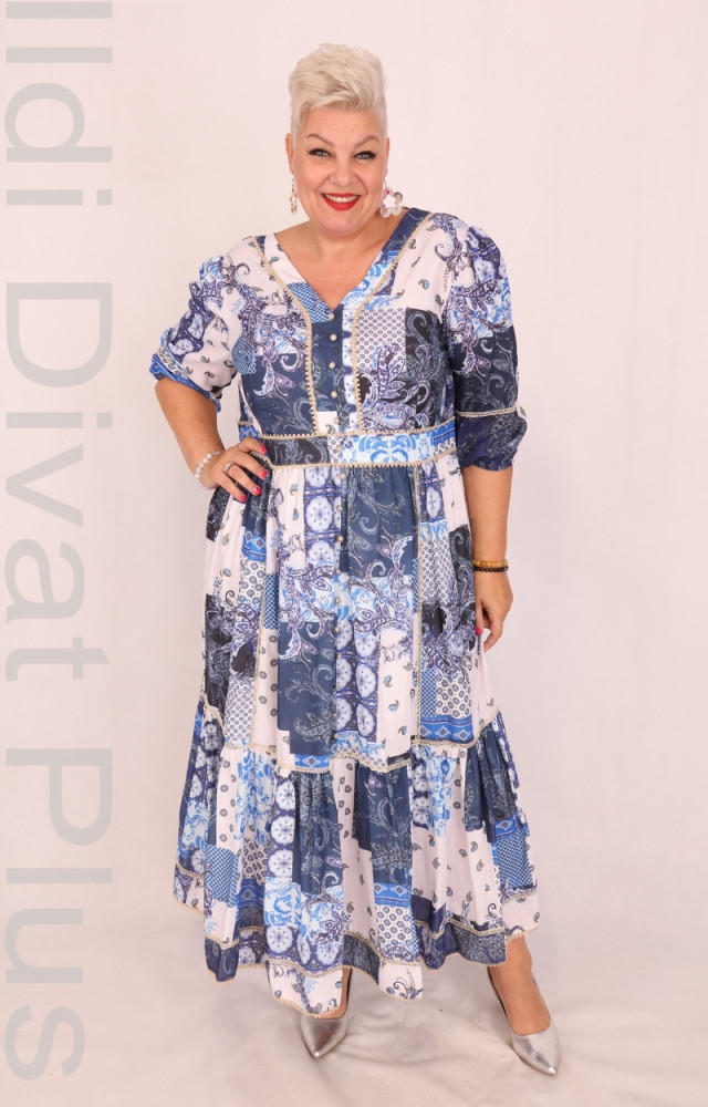 Top Woman kék-fehér mintás, V-kivágott, fodros aljú, lefelé bővülő ruha.