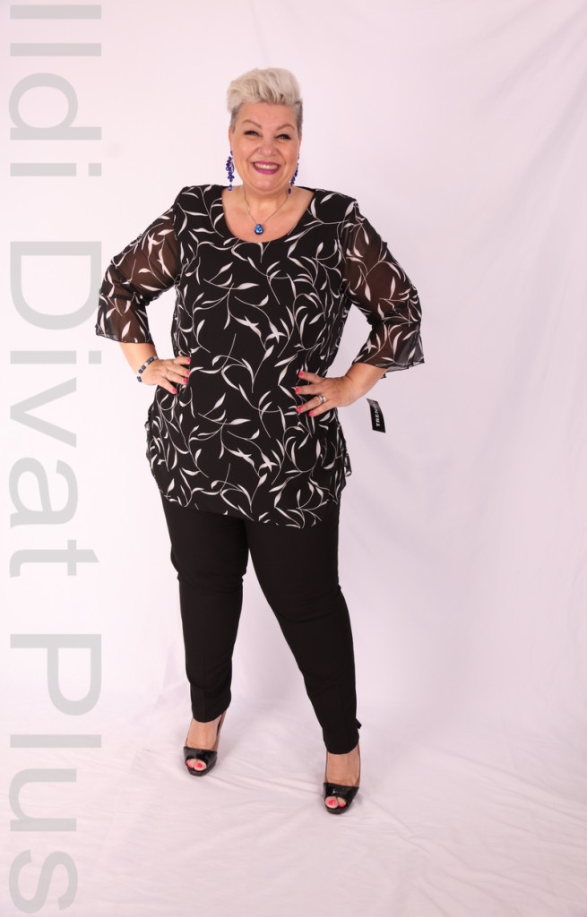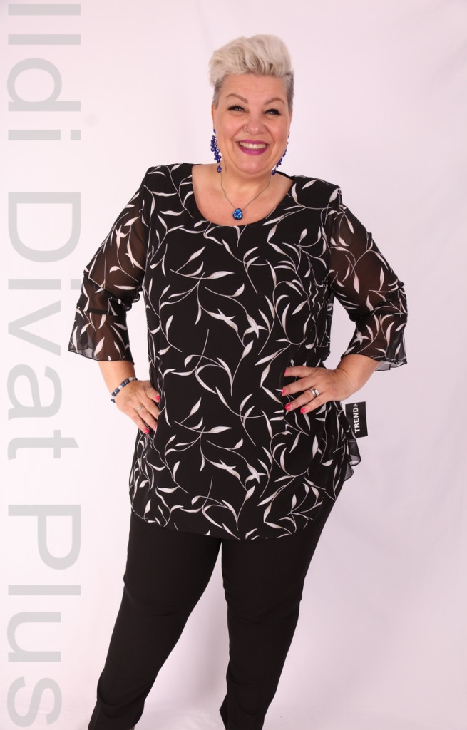 Trend fekete-fehér mintás muszlin tunika+ gumis derekú fekete nadrág.
