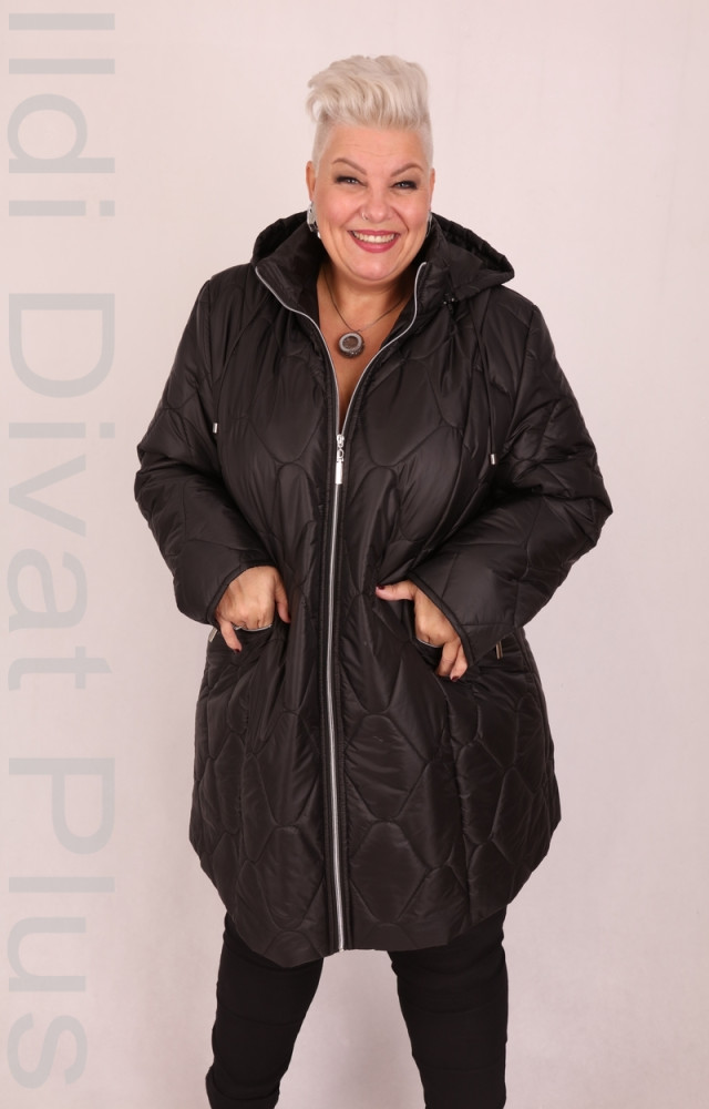 Fekete színű, kapucnis, cipzáras kabát.